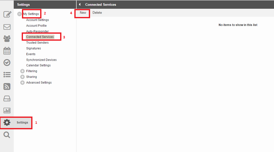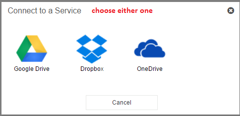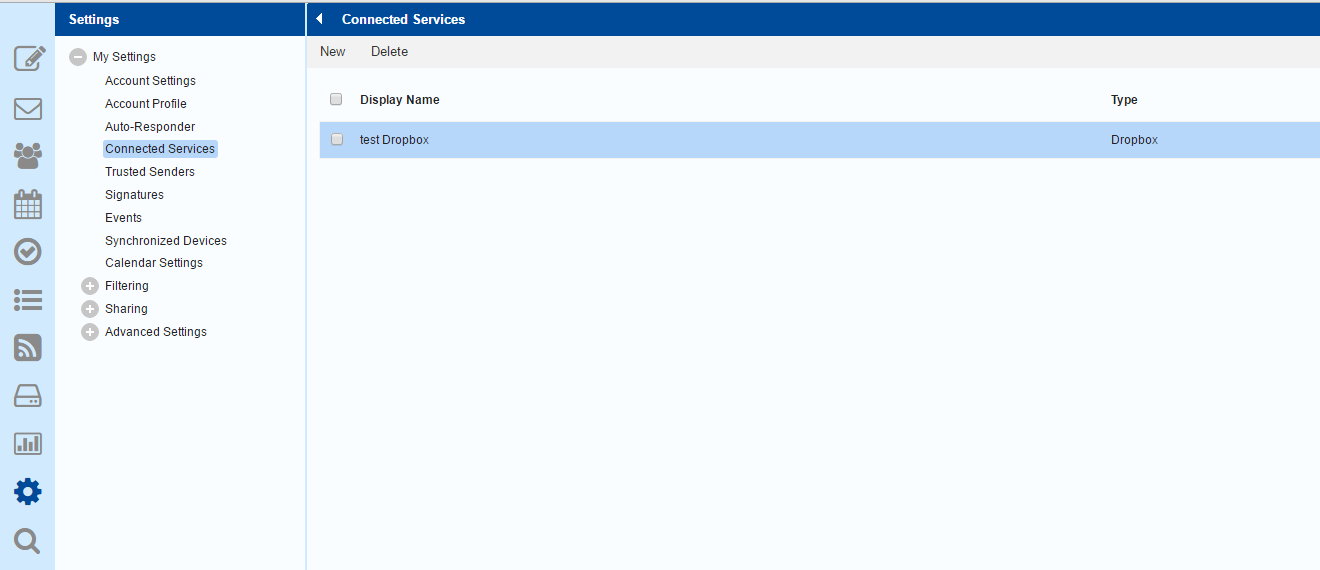2) Navigate to Setting -> My Settings -> Connected Services and click 'New' as below,then choose the preferred storage platform: